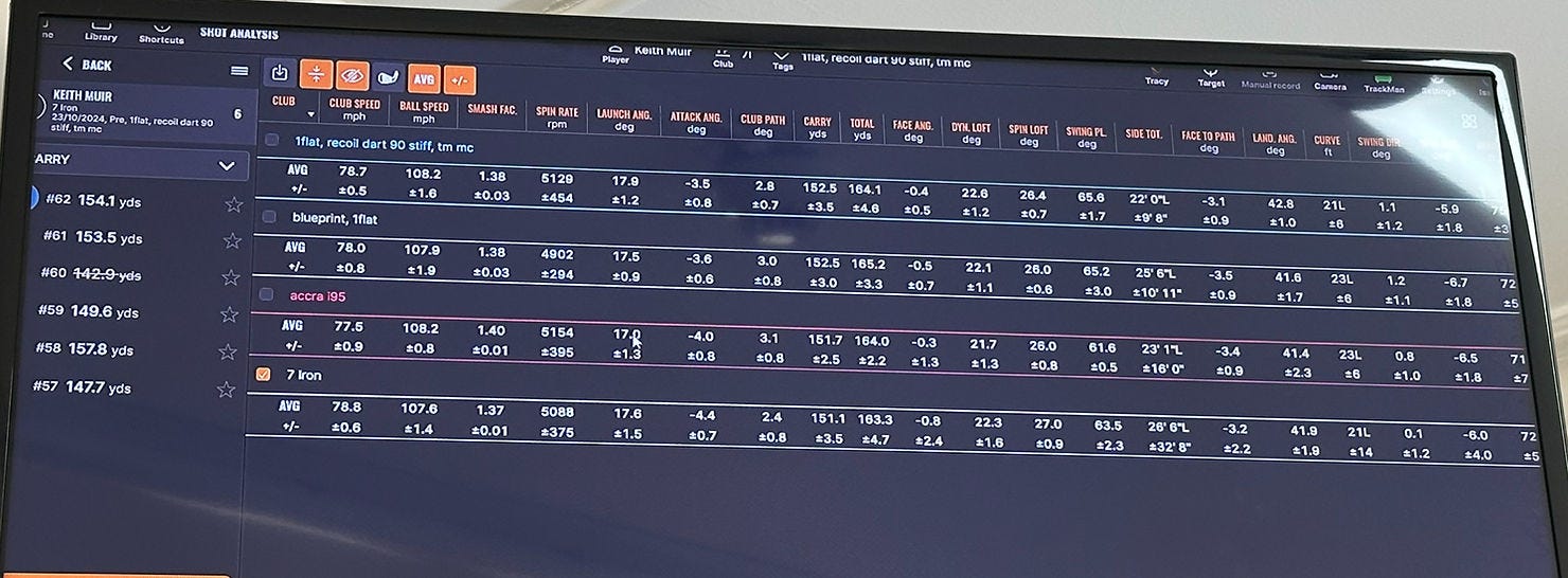 We started the process by getting data for my club before seeing if we could find any alternative, graphite shafted iron, that could match or better its performance. The initial Trackman findings proved again that my irons fit me well, and if it wasn't for my tendonitis issue, then I really have no reason to change them. They hit the windows we want from a flight, carry, spin and landing angle perspective.