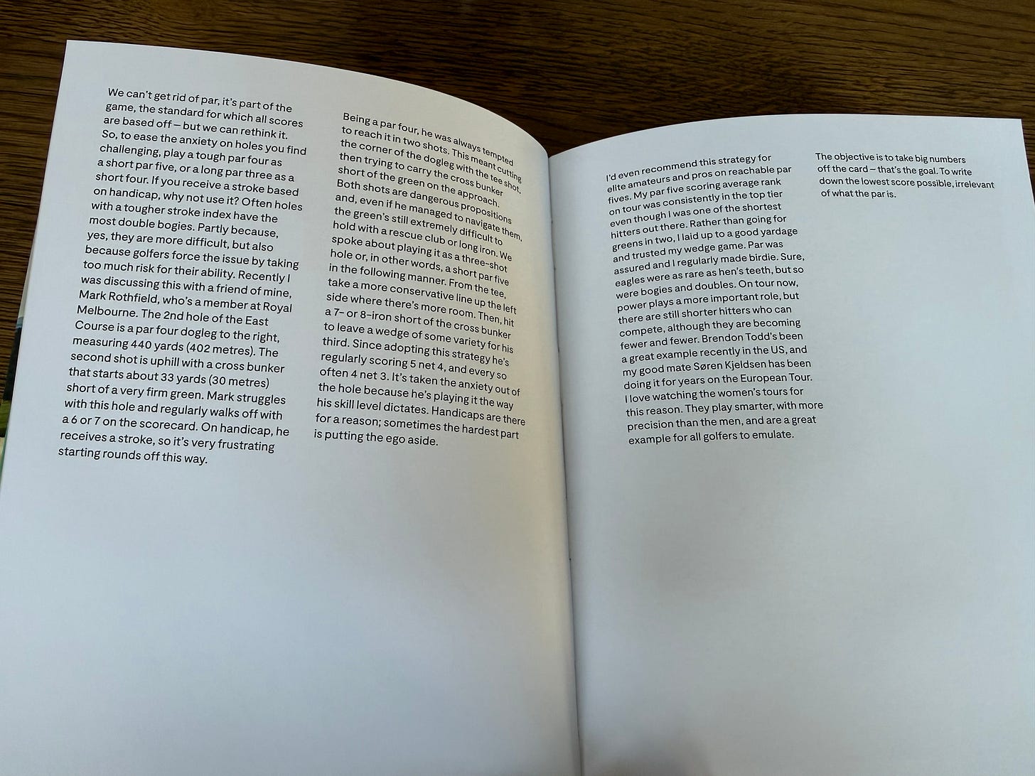 It’s clear, calm, and refreshingly easy to read. Chapters are short, ideas are well organised, the formatting makes it easy to take notes on the pages as you are reading, and you can jump around depending on what part of your game needs attention. This isn’t a book you feel guilty about not finishing in order (although that’s how I prefer to read books) — it’s one you can come back to when your golf starts drifting, and you are looking for some practical pointers to get back on track.