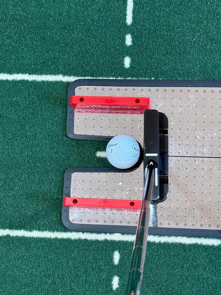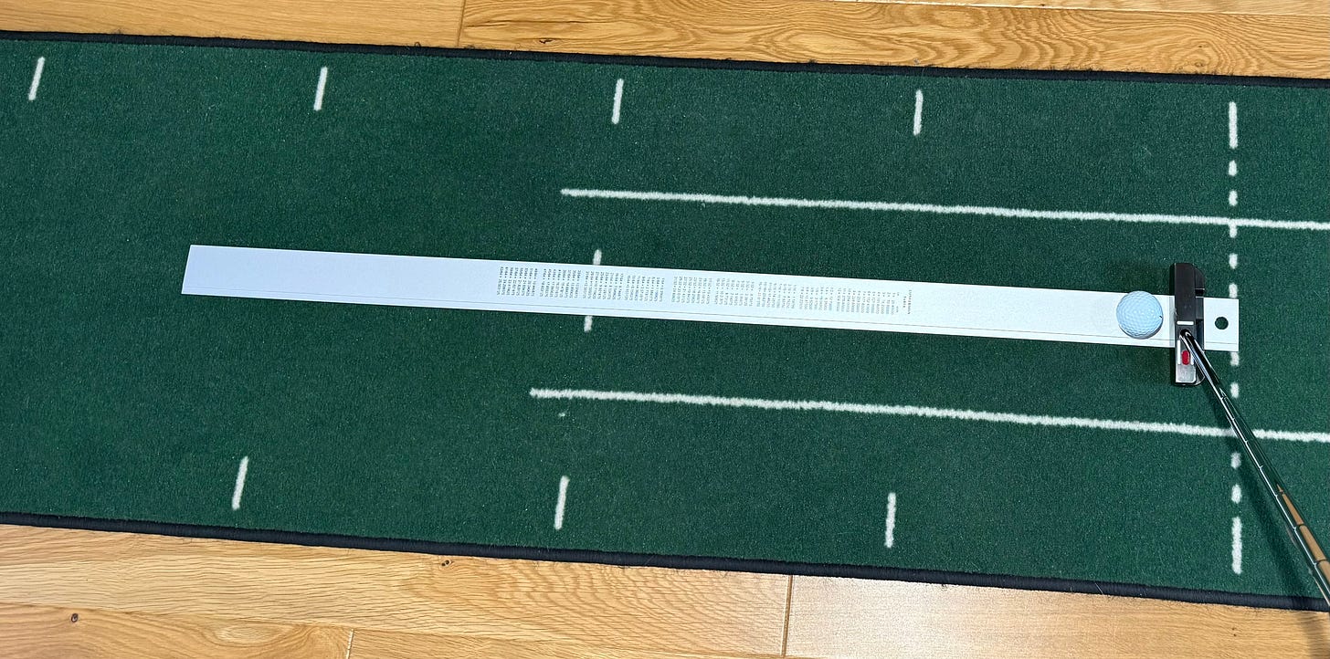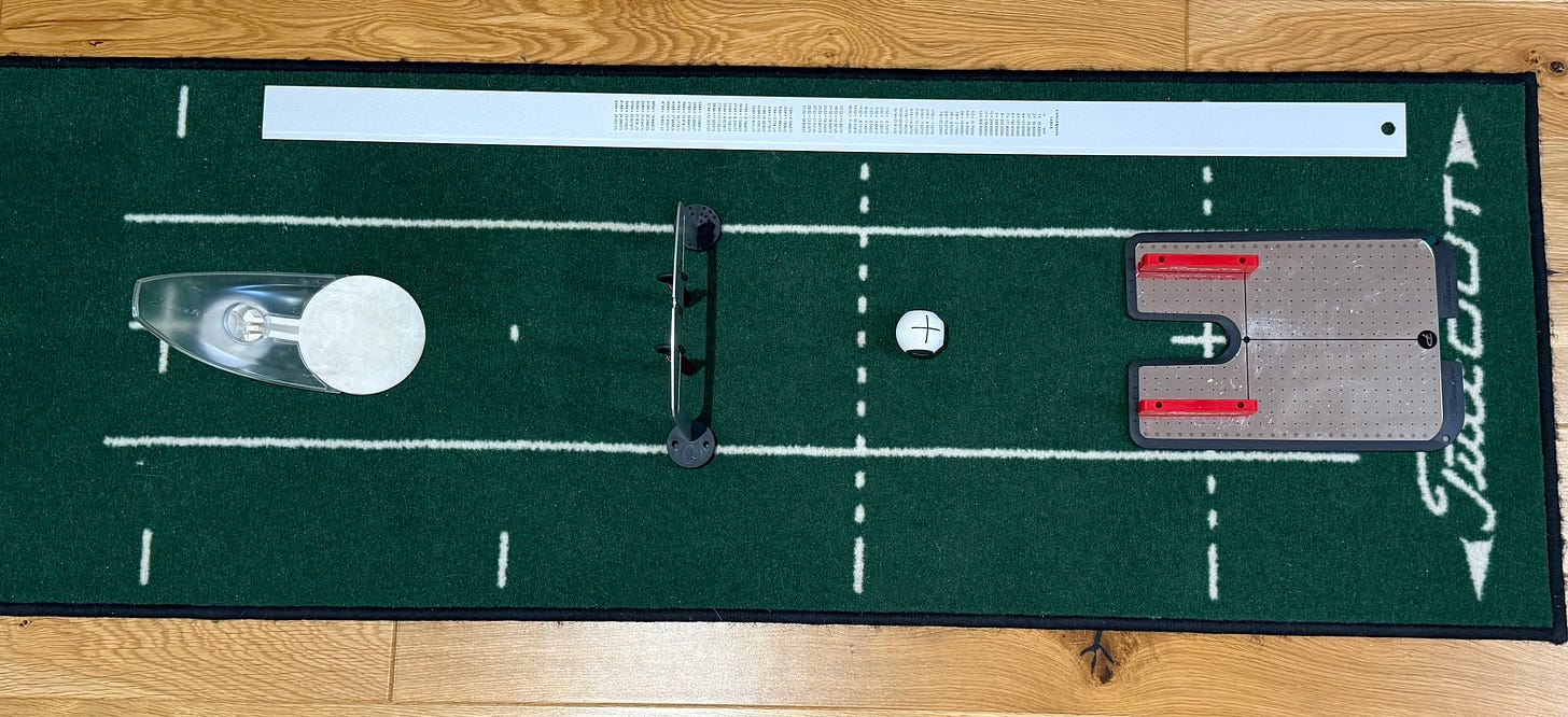 This is my little indoor lab: a PuttOut mat, a mirror, a ruler, and a couple of gates that don’t let you pretend.