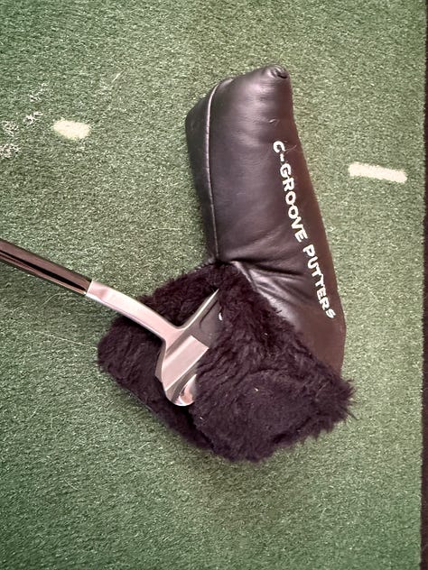 My first impression was simple: wow, this is a really nice putter. The offset is spot on, the contrasting colours are excellent, with a lighter leading edge and a darker rear section, and it sits beautifully behind the ball. It even came with a headcover that’s also in excellent condition, but it’s a bit quirky, so more on that later.